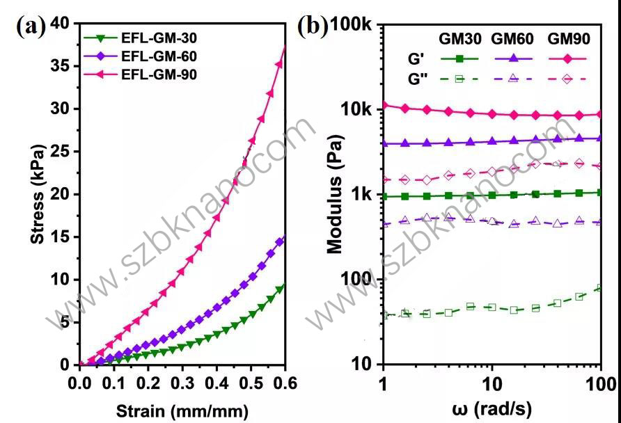 圖3 三種型號GelMA的力學測試:(a) 壓縮曲線;(b) 流變曲線(GelMA濃度為10 % w/v)