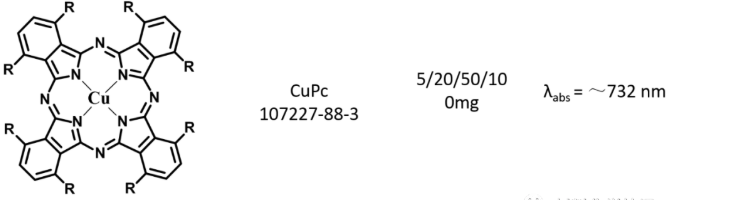 金屬酞菁類熒光材料為綠色固體,易溶于有機溶劑,吸收/熒光波長位于近紅外區,在熒光成像,光聲成像,核磁共振成像,光熱治療,光動力學治療,聲動力學治療以及三重態-三重態湮滅上轉換(TTA)等領域均具有廣泛的應用前景。