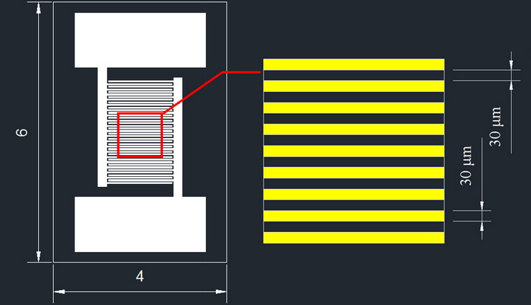 2.線寬:30um,線距:30um,指長(zhǎng): 1.5mm,叉指對(duì)數(shù):20(40指).3.電極襯底為單晶硅,硅片表面生長(zhǎng) SiO2,厚度為300nm;4.金屬層結(jié)構(gòu):Cr/Au,厚度分別為10nm,100nm;