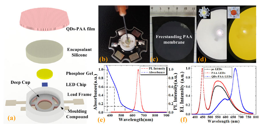 量子點的溫度穩定性是片上大功率LED器件集成的關鍵,有待進一步提高。CdSe/ZnS量子點研制出一個暖白光LED器件,其中CdSe/ZnS納米粒子通過自組裝工藝將CdSe/ZnS納米粒子集成到多孔陽極氧化鋁(PAA)薄膜中,形成鏈式結構。實驗證明在甲苯溶劑中的量子點濃度范圍為1%mg/ul~1.2%mg/ul時,在PAA薄膜中具有最好的光致激發性能。為驗證該器件的可靠性,該課題組進行了對比實驗。結果表明,加速壽命試驗條件下,器件展現了良好的流明維持效率和小的色漂移。實驗還證明,結溫76℃下,經過1500小時老化試驗后,光衰為其初始值的4.6%。該文章發表在由 AIP主辦的2017年最新一期Applied Physics Letters上,該雜志2017年影響因子為3.4,屬于中科院JCR期刊二區。本項研究為生產高效率高穩定大功率LED器件提供了一種新型技術指導方案。