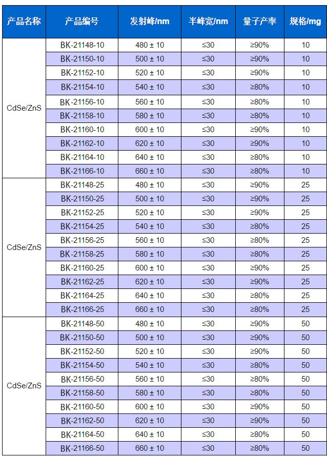 蘇州北科納米科技有限公司生產的油溶性CdSe/ZnS量子點產品是以CdSe為核心,ZnS為殼層,表面由疏水配體包裹的核/殼型熒光納米材料,平均的量子產率為80%,儲存時應避免陽光直射,4度密封暗處保存,可以為客戶訂制生產480nm~650nm任一波長不同克數的產品。本產品具有粒徑均一,吸收光譜寬泛,發射光譜窄而對稱,熒光強度高而穩定等特點,特別適用于量子點發光二極管(QLED)的綠光和紅光組成部分,可應用于太陽能電池、發光器件與生物熒光標記等領域。