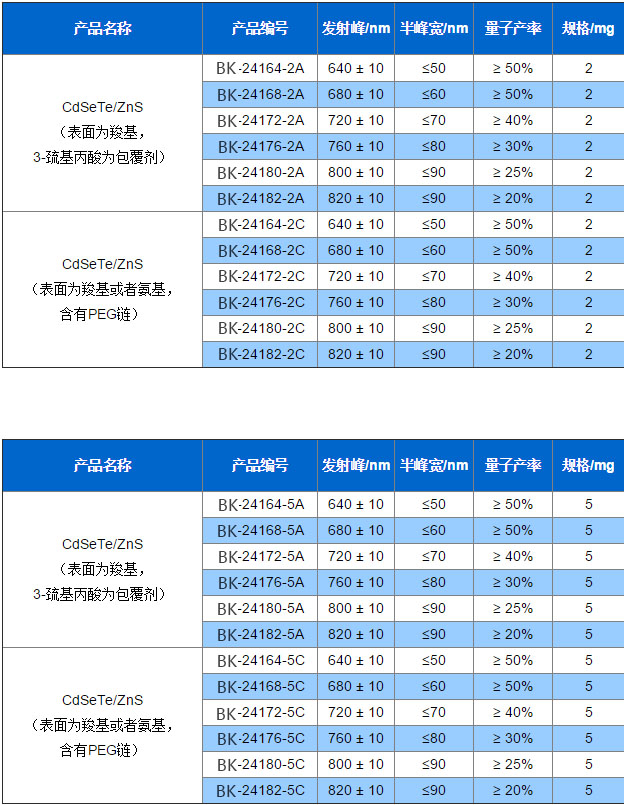 本公司目前可提供四類水溶性CdSeTe/ZnS量子點:(1)表面為負電荷的羧基,3-巰基丙酸作為包覆劑;(2)表面為負電荷的羧基,雙親聚合物作為包覆劑;(3)表面為負電荷的羧基,含有PEG鏈,生物相容性優良,可連接帶有氨基的抗體蛋白等;(4)表面為正電荷的氨基,含有PEG鏈,生物相容性優良,可連接帶有羧基的抗體蛋白等。