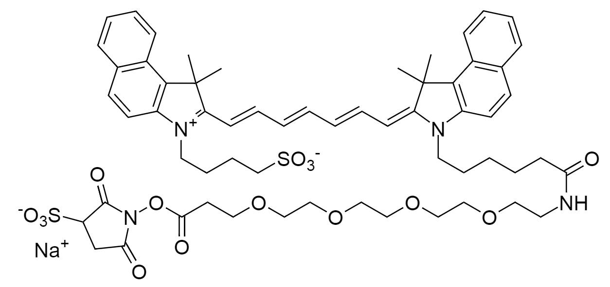 蘇州北科納米科技有限公司生產銷售“ICG-Sulfo-EG4-OSu|吲哚菁綠-磺基-四聚乙二醇-活性酯”“分子量:1177.36,激發(nm):789,發射(nm):814,吲哚菁綠(ICG)是一種用于醫學診斷的花菁染料。”,該產品僅用于科研,如果需要請聯系我們