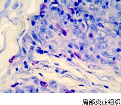 【染色結(jié)果】肥大細(xì)胞顆粒含有肝素和組織胺等,這些屬于硫酸酯,呈異色性。因此,用易染性染料甲苯胺藍(lán)可以使其呈異色性的紅紫色。