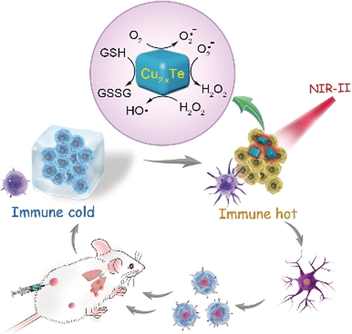 【主要優(yōu)勢】1、Cu2−xTe納米顆粒在近紅外ii (NIR-II)光下表現(xiàn)出可調(diào)節(jié)的酶模擬活性(包括谷胱甘肽氧化酶和過氧化物酶);2、Cu2−xTe人工酶催化的級聯(lián)反應(yīng)逐漸升高腫瘤內(nèi)氧化應(yīng)激,誘導(dǎo)免疫原性細胞死亡;