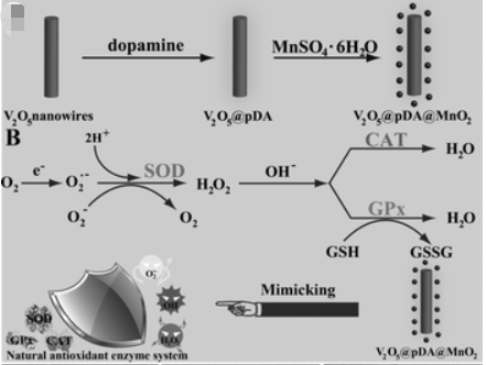 1、V2O5@pDA@MnO2納米復合材料可以作為一種多納米酶模型來模擬細胞內基于抗氧化酶的防御過程,其中SOD、CAT和GPx共同參與;