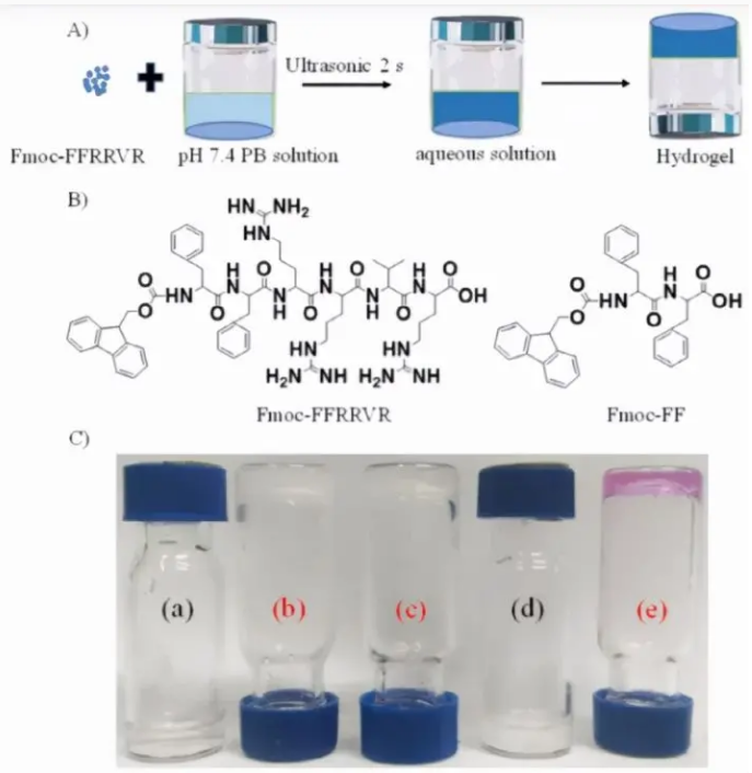 其他說明:密封狀態下保質期半年【主要優勢】與 Fmoc-FF 相比,Fmoc-FFRRVR 更傾向于在溫和條件下形成水凝膠,凝膠時間僅為 2 s