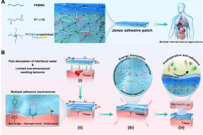 A Conformable and Tough Janus Adhesive Patch with Limited 1D Swelling Behavior for Internal Bioadhesion