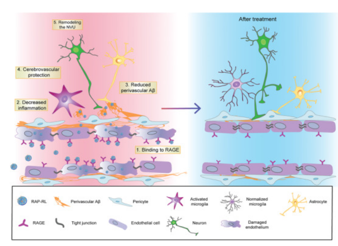 其他說明:密封狀態下保質期半年【主要優勢】RAP- RL通過RAP與RAGE的特異性結合在大腦微血管中積累,有效加速血管周圍Aβ的清除,使腦血管形態和功能正常化,恢復NVU的結構完整性和功能, 可顯著改善APP/PS1小鼠的空間學習記憶能力。