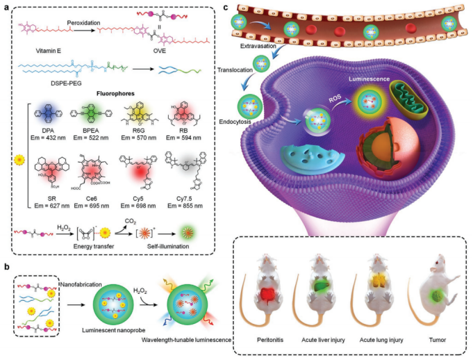 Wavelength-Tunable, Long Lifetime, and Biocompatible Luminescent Nanoparticles Based on a Vitamin E-Derived Material for Inflammation and Tumor Imaging