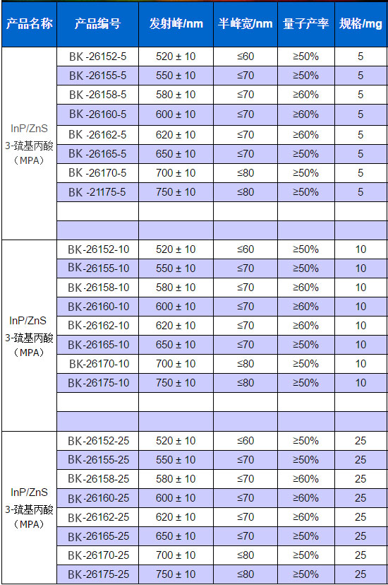 水溶性InP/ZnS 高亮綠光和紅光 PL 520 nm-- 750 nm3-巰基丙酸(MPA)