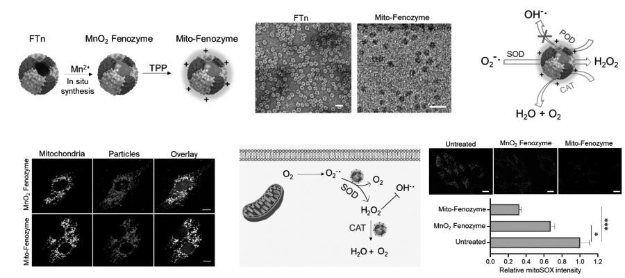 Product performance: Human-derived ferritin heavy chain recombinant protein is used as the protein backbone, and ferritin/MnO2 nanozymes are synthesized in situ by using its natural affinity for metal ions. A hybrid nanozyme (Mito-Fenozyme) with mitochondrial targeting ability was obtained by further modification of triphenylphosphonium (TPP). The results show that the Mito-Fenozyme nanozyme has high SOD enzyme activity and shows relatively good catalase (CAT) activity. What’s more interesting is that the nanozyme did not show obvious peroxidase (POD) activity. This feature enables Mito-Fenozyme nanozyme to not only effectively eliminate O2•– through the SOD-CAT cascade reaction, but also to avoid POD induces high cytotoxic hydroxyl radicals (•OH). Cell tests have further confirmed that the nanozyme has the ability to target mitochondria and eliminate mitochondrial source O2•-
