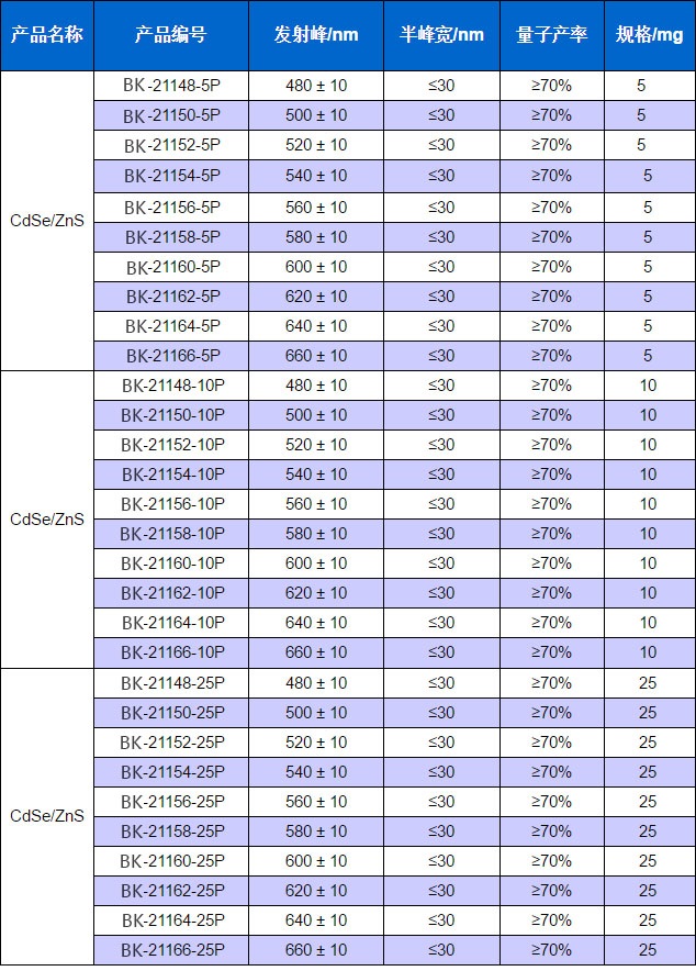 The water-soluble CdSe/ZnS quantum dot products produced by Suzhou Beike Nanotechnology Co., Ltd. are based on CdSe as the core, ZnS as the shell, and core/shell fluorescent nanomaterials coated with hydrophilic ligands. The average quantum yield is 70%, avoid direct sunlight during storage, and store in a sealed dark place at 4 degrees. Products with any wavelength from 480nm to 650nm can be customized for customers. This product has the characteristics of uniform particle size, broad absorption spectrum, narrow and symmetric emission spectrum, and high and stable fluorescence intensity.