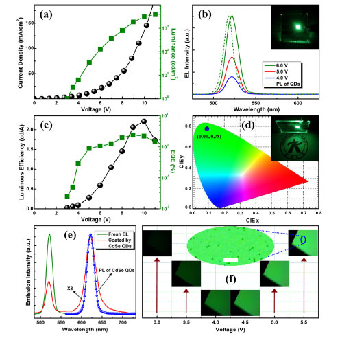 The high-brightness and high-stability green quantum dot light-emitting diode (G-QLED) device developed by Zhengzhou University, Jilin University, and Changchun Institute of Optics, Fine Mechanics and Physics, Chinese Academy of Sciences, applied Beike’s perovskite quantum dots, exhibits a series of excellent characteristics : Maximum brightness 3809 cd/m2, current efficiency 2.25 cd/A, external quantum efficiency (EQE) 2.39%. It can maintain 80% of the original device efficiency under 10V voltage for 10 hours without sealing. The article was published in the latest issue of Nano Letters in 2016 sponsored by the American Chemical Society (ACS). The magazine has an impact factor of 13.8 in 2016. It belongs to the first section of the JCR journal of the Chinese Academy of Sciences and is an authority in the field of nanodevices. This research provides a new technical guidance program for the production of high-efficiency quantum dot lighting devices and full-color display screens.