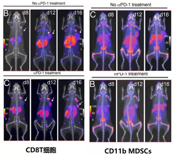 二、納米抗體用于腫瘤影像診斷1、PET(正電子發射型計算機斷層顯像)在PET成像中,同位素標記的抗體或者抗體片段被用于體內標記藥物靶點,具有良好的特異性。納米抗體由于分子量小,具有很好的組織穿透性,已被用于評估患者藥物靶點分布以及腫瘤微環境研究。68/67Ga或89Zr標記的EGFR抗體7D12是第一個在PET中使用的納米抗體,顯示出良好的腫瘤背景差。2016年68Ga標記的HER納米抗體被用于乳腺癌HER2表達的評估[5],之后還陸續開展了兩個Ⅱ期臨床試驗。腫瘤微環境中的髓系抑制細胞(MDSCs)是重要的免疫治療耐藥因素之一。在小鼠模型,89Zr標記的納米抗體被用于 PET分析PD-1阻斷治療前后CD8+T細胞和CD11b+ MDSCs細胞的分布[6]。