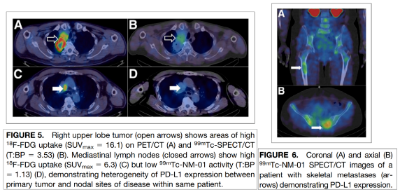 SPECT成像應用伽馬發射的放射性同位素,使用99mTc標記納米抗體,可以在臨床檢測藥物靶點的分布情況,作為用藥指導。2019年上海第一人民醫院核醫學科與倫敦國王學院的聯合研究使用99mTc標記的PD-L1單域抗體評估PD-L1在非小細胞肺癌患者體內表達,為免疫檢查點抗體治療提供基礎。