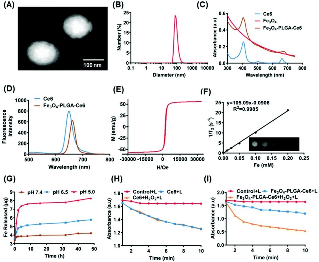 鐵死亡治療是利用鐵生物誘導物產生致死性脂質過氧化以誘導腫瘤細胞死亡,它也被認為是一種很有發展前景的癌癥治療策略。然而,如何增加腫瘤微環境(TME)中活性氧(ROS)的積累以提高其抗腫瘤療效仍是一個研究挑戰。西南大學宋楊教授和朱小康副教授設計了一種包覆有PLGA,含有鐵氧化物(Fe3O4)和光敏劑Ce6的聚納米系統Fe3O4-PLGA-Ce6,并將其用于協同鐵死亡-光動力抗癌治療。