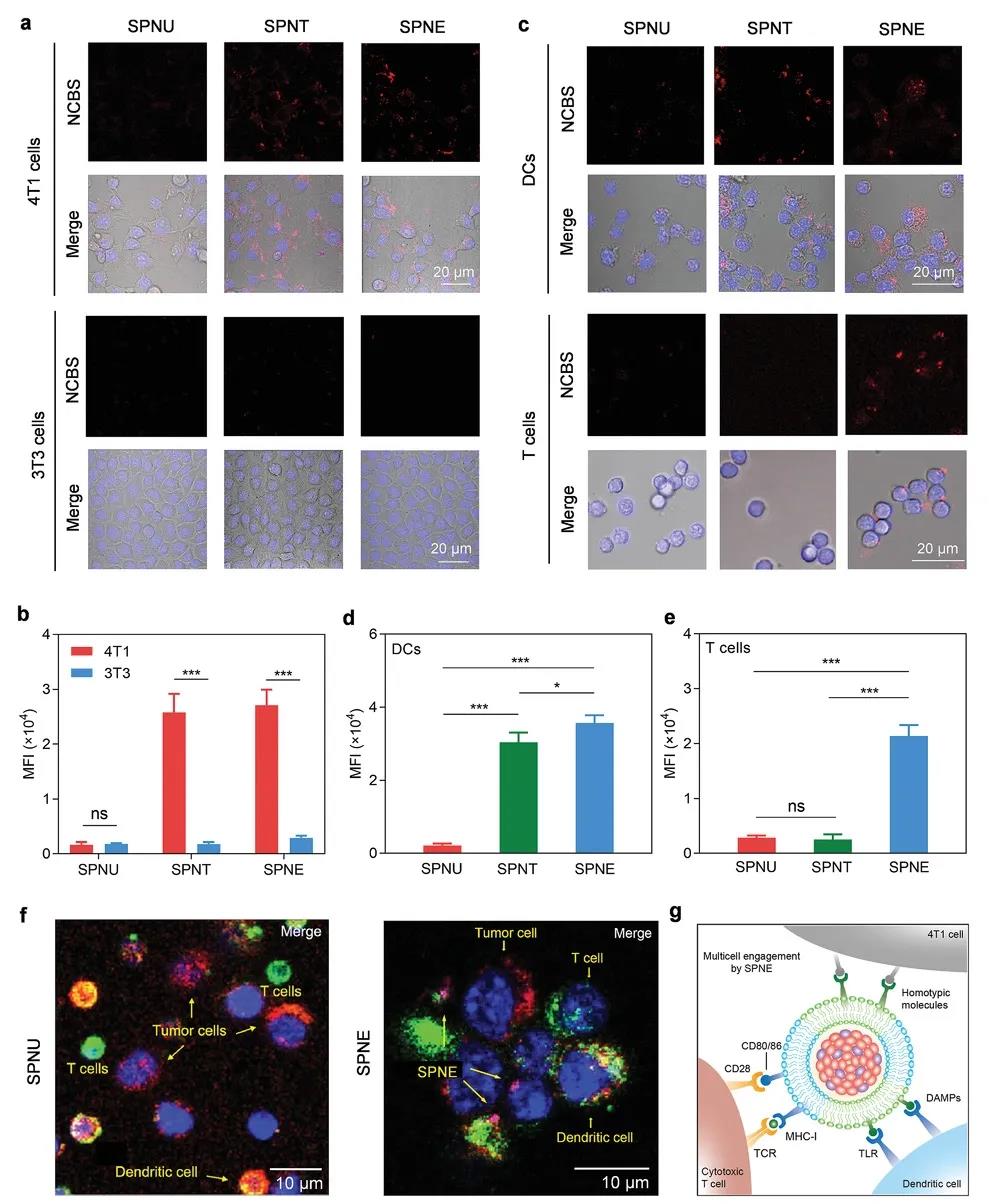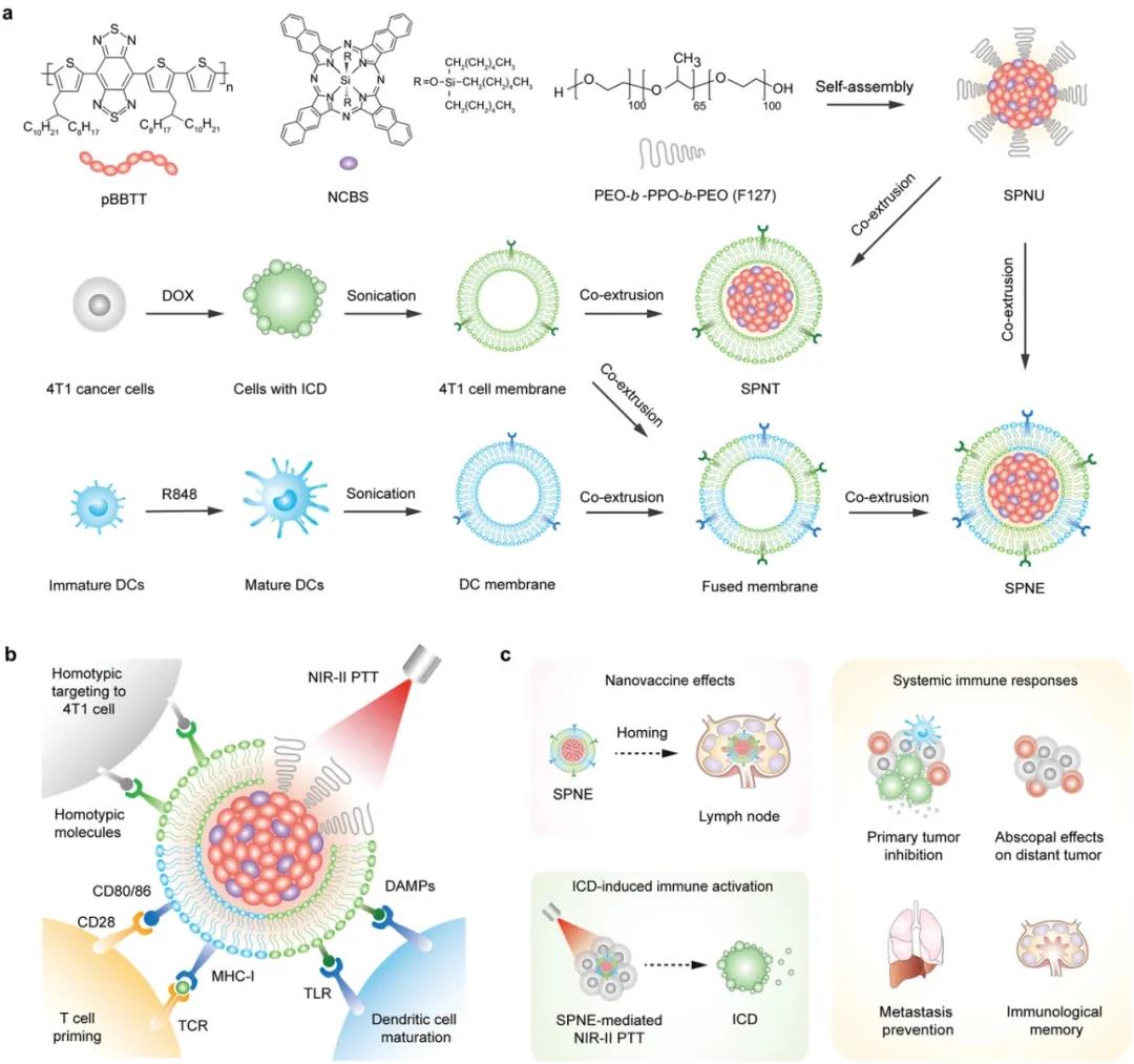 納米接合器由一種NIR‐II吸收聚合物作為光熱核,由免疫工程腫瘤細胞和樹突狀細胞(DC)形成的融合膜偽裝成癌癥疫苗的外殼,這種設計允許腫瘤細胞、DC和T細胞之間的多細胞結合。與淋巴結和腫瘤的高聚集相關,SPNE的多細胞結合能力使腫瘤細胞、DCs和T細胞之間能夠進行有效的交叉相互作用,導致相對于裸的或腫瘤細胞包覆的納米粒子而言T細胞激活增強。