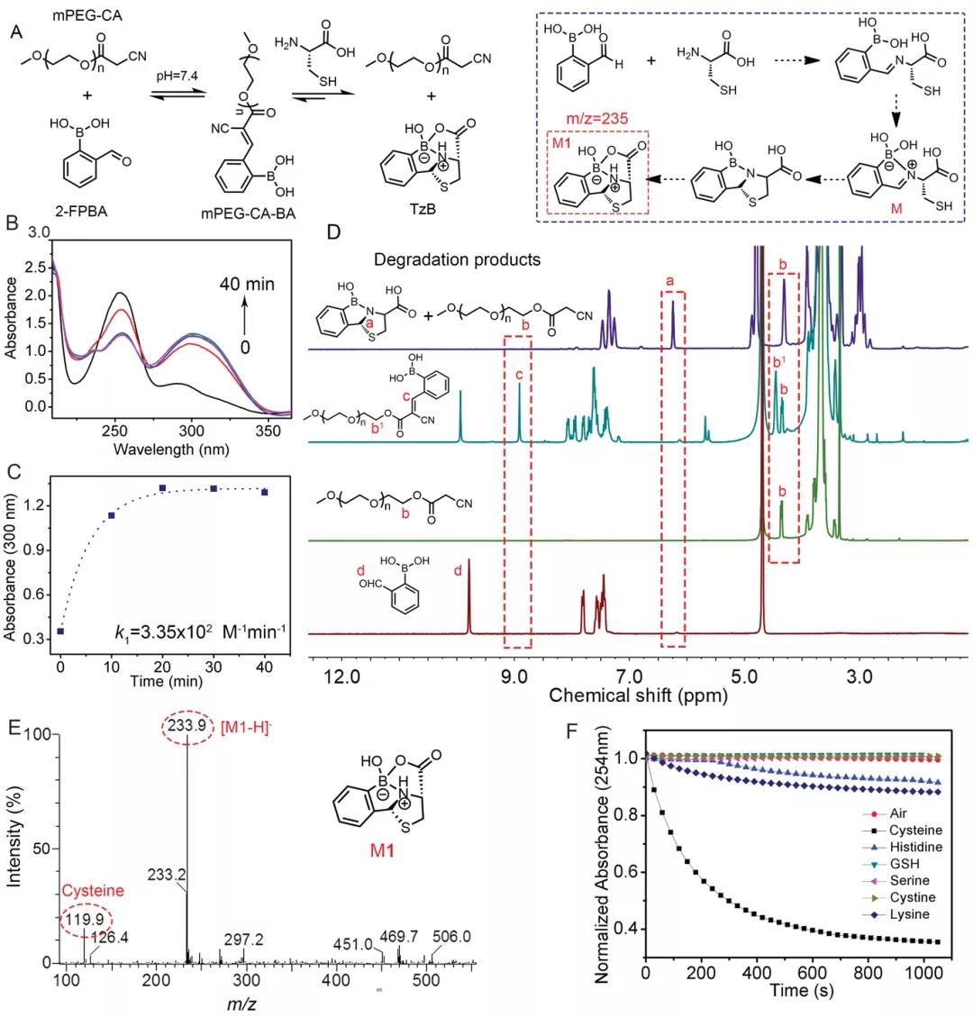 流程1,可注射自愈水凝膠的制備示意圖。A)2-FPBA與PVA和4-臂PEG-CA的反應制備水凝膠。B)暴露于PBS半胱氨酸溶液時,2-FBC水凝膠溶解。C)用作敷料時,2-FBC水凝膠可快速閉合傷口,并通過半胱氨酸按需溶解。結果與討論【2-FBC水凝膠的合成及溶解機制】作者首先測量UV-vis光譜證實半胱氨酸與2-FPBA之間反應的擬議機制,在300 nm處的新峰歸因于C=C雙鍵的形成,說明CKC反應的反應動力學;半胱氨酸會大大降低300和254 nm處的吸光度值,表明半胱氨酸可快速分解mPEG-CA-BA(圖 1C)。1H NMR證實了mPEG-CA與2-FPBA反應形成了新綴合物mPEG-CA-BA及mPEG-CA-BA的解離(圖1D)。此外,反應物(mPEG-CA和2-FPBA)和產物(mPEG-CA-BA)共存,表明C=C雙鍵是動態共價鍵。ESI-MS及FTIR光譜證實了TzB配合物的形成(圖 1E- F)。這些結果表明,通過mPEG-CA與2-FPBA的綴合形成的動態C=C雙鍵可被半胱氨酸特異性解離。