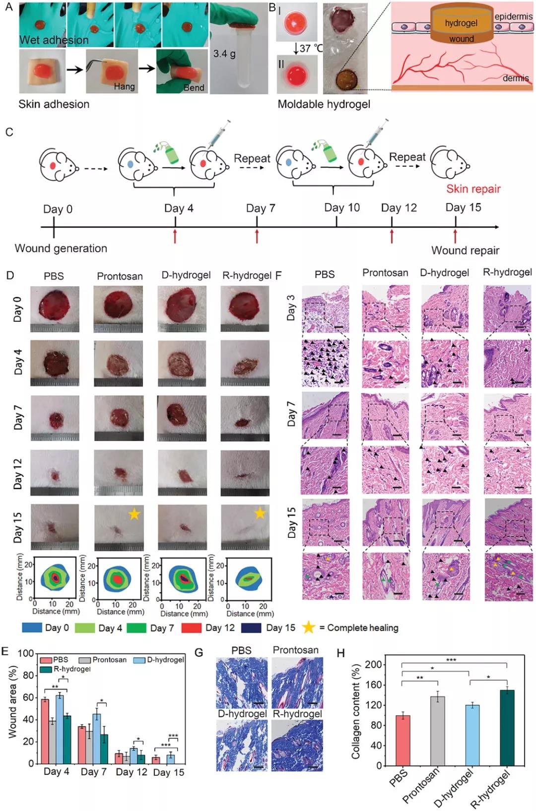 圖4,2-FBC水凝膠的黏附行為和體內傷口愈合效果。A)沖洗后,2-FBC水凝膠牢固地粘附在橡膠手套上,可以承受3.4 g的負荷。B)2-FBC水凝膠可成型。C)2-FBC水凝膠傷口處理過程示意圖。D)用PBS(pH 7.4),市售傷口敷料Prontosan,D-水凝膠(將2-FBC水凝膠注射到傷口區域然后進行手術切除)和R-水凝膠(將2‐FBC水凝膠注入傷口區域并通過半胱氨酸誘導的溶出去除)。F)每個治療組傷口組織的H&E染色組織學圖像。G)在第15天皮膚組織再生的Masson染色組織學圖像。H)基于Masson染色的不同治療組中的膠原含量。結論:總之,作者開發了一系列新的由CKC反應和硼酸酯組成的C=C雙鍵組成的串聯動態共價鍵,用于構建具有快速膠凝和半胱氨酸特定按需溶解特性的水凝膠敷料。水凝膠可注射,可自我修復,可通過形成TzB復合物而被半胱氨酸特異性降解。當用作傷口敷料來治療全層傷口時,水凝膠可在數秒內迅速閉合傷口,還能按需溶解以更換敷料。這種動態水凝膠為傷口敷料開辟新途徑,并進一步擴大基于Knoevenagel縮合反應的動態水凝膠的應用。