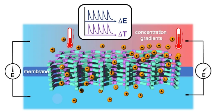 感知溫度對生物體維持正常的生命活動至關(guān)重要。在哺乳動物中,熱刺激通過熱敏感受器(thermo-TRP)離子通道轉(zhuǎn)化為電化學(xué)電位,然后通過神經(jīng)細(xì)胞轉(zhuǎn)化為動作電位,如疼痛感的產(chǎn)生。從仿生學(xué)角度出發(fā),在體外模擬熱信號的傳導(dǎo),設(shè)計(jì)恰當(dāng)?shù)募{米通道將化學(xué)信號轉(zhuǎn)化為電信號,或是在人工系統(tǒng)中植入熱活性分子來調(diào)節(jié)熱感覺,設(shè)計(jì)仿生“溫度計(jì)”,是科學(xué)家們長久以來的研究熱點(diǎn)。此外,實(shí)現(xiàn)可逆的熱響應(yīng)性,并且只在溫度達(dá)到熱轉(zhuǎn)變溫度時起作用,將溫度響應(yīng)限制在微小范圍內(nèi)成為了研究難點(diǎn)。浙江大學(xué)孫琦教授團(tuán)隊(duì)聯(lián)合北德克薩斯州大學(xué)馬勝前教授團(tuán)隊(duì)創(chuàng)造性地制備了一種基于離子共價(jià)有機(jī)框架(COF)的納米流控膜,它能夠智能地監(jiān)測溫度變化,并以連續(xù)電位差的形式顯示出來。亞納米通道存在高密度的電荷位點(diǎn),使得膜層具有高選擇性和高達(dá)1.27 mV K-1的熱感覺靈敏度。該系統(tǒng)還具有良好的耐鹽性,工作溫度寬,對溫度刺激的同步響應(yīng),以及長期超穩(wěn)定性的優(yōu)勢。該研究以題為“Covalent organic framework nanofluidic membrane as a platform for highly sensitive bionic thermosensation”的論文發(fā)表在最新一期《Nature Communications》上。