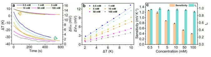 圖3 (a) Tp Tag-COF/PAN(黑色,1/0.1 mM;綠色,10/1mM;橙色,100/10 mM KCl溶液)。(b)van der Waals表面靜電勢(ESP)和各ESP范圍內(nèi)的面積百分比。ESP的有效表面局部極小值和極大值分別用紅色和藍(lán)色球體表示,并用數(shù)字標(biāo)記。(c)TpTag-COF亞納米通道的離子輸運(yùn)行為示意圖。MD模擬表明,Tp Tag-COF/PAN膜的K+透過率高于Cl- (紫色,K;綠色,Cl;紅色,O;白色,H;灰色,Tg Tag-COF層)。【膜的熱電響應(yīng)表征】作者進(jìn)一步研究了Tp Tag-COF/PAN的熱電響應(yīng)性。膜被放置在滲透室的兩個溫度控制室之間。溫度梯度控制在~10 K。熱刺激驅(qū)動離子移動,在膜的邊界處產(chǎn)生電位差并記錄。采用熱電偶實(shí)時監(jiān)測兩室溫差,Ag/AgCl電極檢測開路電壓(Voc)。離子選擇透過性依賴于溶液濃度;因此,首先評估了KCl濃度對Tp Tag-COF/PAN熱電響應(yīng)性能的影響。為了研究熱感覺的敏感性,在兩個腔室中填充了0.5~100 mM范圍內(nèi)的KCl水溶液,并觀察到相似的隨時間變化的趨勢(圖4a)。為了突出COF的連續(xù)規(guī)則孔道的作用,作者比較了由1,3,5-苯三羰基(Bt)在PAN上縮合合成的Bt Tag/PAN膜與Tp Tag-COF/PAN的熱感覺敏感性(補(bǔ)充材料)。