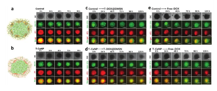 氧化鈰納米粒子(CeNPs)的仿生酶活性主要傾向于超小粒徑和裸露的表面。不幸的是,這兩個特點不利于其在體內(nèi)的應(yīng)用,因為容易聚集和快速腎臟過濾。為了充分利用CeNP的抗癌活性,美國南卡羅萊納大學(xué)Peisheng Xu等人開發(fā)了一種同源靶向氧化鈰納米顆粒系統(tǒng)--靶向CeNP (T - CeNP),該系統(tǒng)整合了生物可降解的樹枝狀介孔二氧化硅納米顆粒、類超氧化物歧化酶和過氧化氫酶的CeNP,以及癌細(xì)胞膜的偽裝涂層。