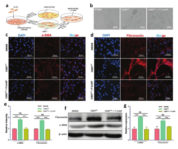 (2)隨后,T - CeNP有效地阻止了與癌癥相關(guān)的成纖維細(xì)胞轉(zhuǎn)分化,并將其重新編程成正常的成纖維細(xì)胞。