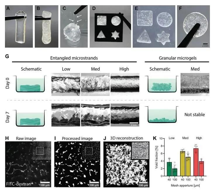 為了研究3D打印纏結(jié)微束型凝膠的可調(diào)性,研究者通過調(diào)整UV交聯(lián)時(shí)間(20s、60s、180s)制備了一系列不同交聯(lián)強(qiáng)度的HA-MA體系凝膠。對比顆粒水凝膠,37℃下浸泡于PBS 7天中,塊體微凝膠在1h內(nèi)瓦解掉,而纏結(jié)微束型水凝膠在水介質(zhì)中具有長期的凝聚力。為了評估HA-MA纏結(jié)微束型凝膠的孔隙率,研究者將凝膠浸入高分子量葡聚糖熒光染料中。由于葡聚糖的分子量較大,圖2H顯示出熒光標(biāo)記的葡聚糖只能進(jìn)入凝膠束之間,而無法穿透水凝膠的凝膠相,基于此,研究者可用來計(jì)算凝膠的孔隙率(圖2)。