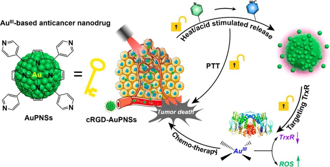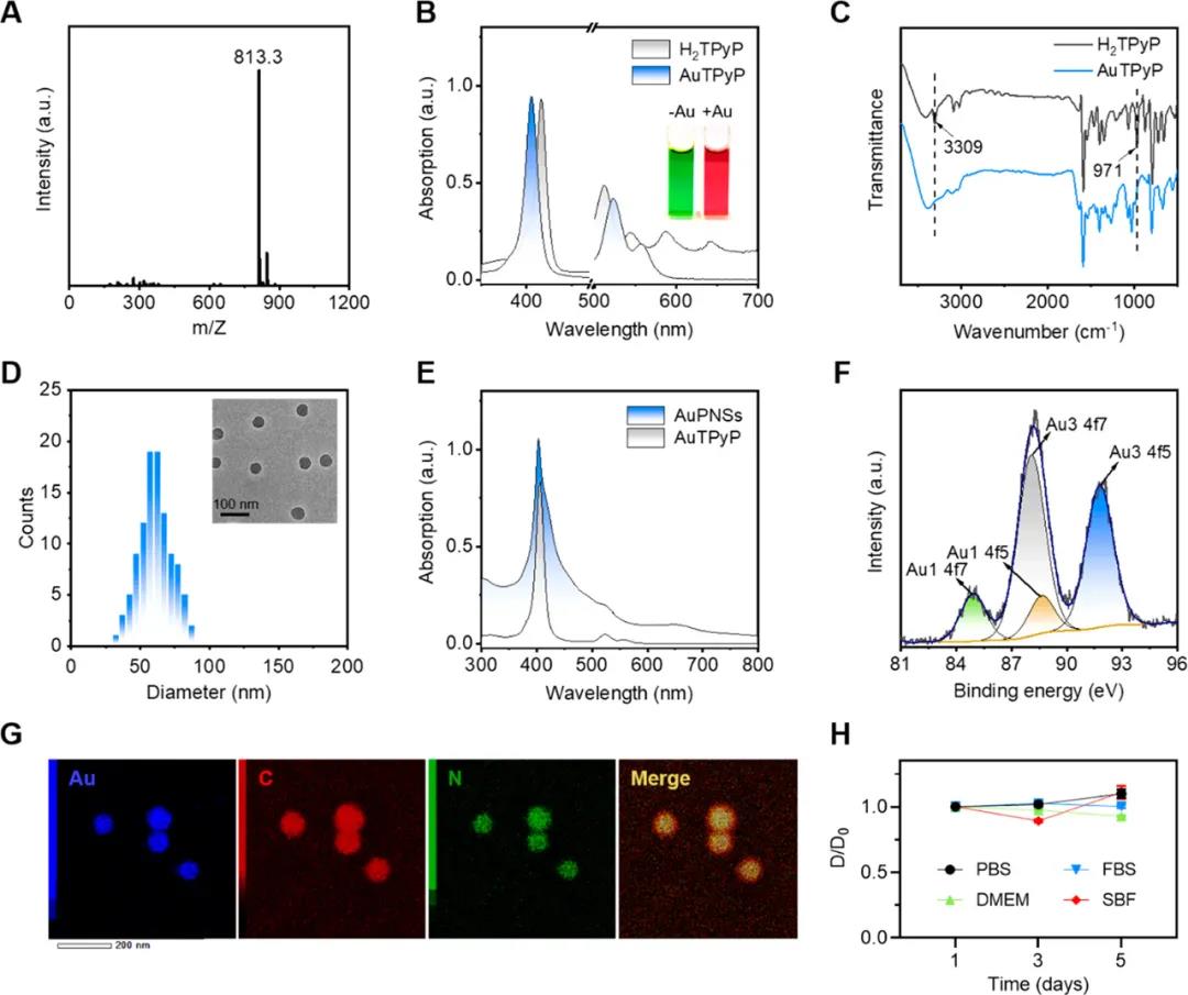 于此,河南大學(xué)白鋒教授開發(fā)了一種響應(yīng)型無載體非共價自組裝策略,構(gòu)建了金屬化Au(III)四(4-吡啶)卟啉(AuTPyP)抗癌藥物,并將其用于制備對熱/酸雙刺激響應(yīng)型納米藥物,它在輻照下能夠產(chǎn)生比單體更為顯著的光熱效應(yīng)。