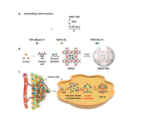 本文要點:(1)MOF-199是一種基于Cu(II)的金屬有機骨架,可作為惰性載體負載PSs前體以實現(xiàn)高效遞送。同時,它也能夠作為Cu(I)催化劑原料,進而用于原位點擊反應(yīng)以在癌細胞中形成PSs。
