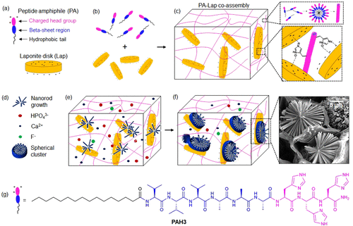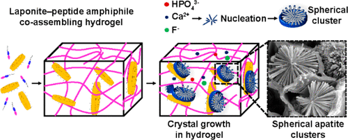 該團隊開發(fā)了一種共組裝有機-無機水凝膠平臺,用于體外晶體生長,由 3D 超分子限制框架內(nèi)的顆粒附著機制介導(dǎo)。設(shè)計策略取決于 Lap 納米盤和陽離子 PAH3 分子之間的靜電相互作用,以將有機和無機組分的固有特性整合到獨特的有機-無機水凝膠結(jié)構(gòu)中。所得材料顯示出高表面積、高機械性能和自修復(fù)性能。此外,共組裝的 PA-Lap 水凝膠顯示出一種納米級結(jié)構(gòu),可作為羥基磷灰石從有序納米棒分級生長到明確定義的球形簇的密閉空間。該研究探索了這種礦化機制,作為一種仿生 3D 模型來調(diào)節(jié)氟化羥基磷灰石的成核和時空組織。