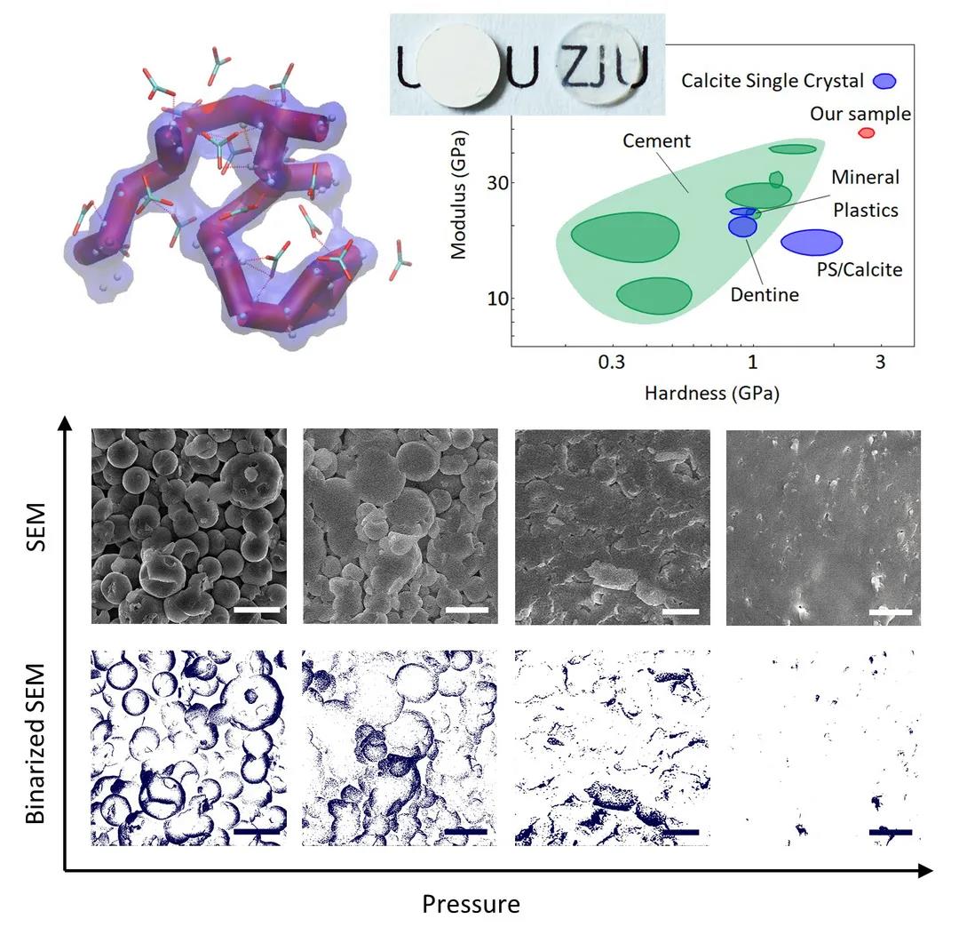 近日,浙江大學化學系劉昭明研究員和唐睿康教授團隊在全球頂級科研期刊《Science》雜志發表了題為“Pressure-driven fusion of amorphous particles intointegrated monoliths (《壓力驅動無定形顆粒融合為塊體材料》”的文章,研究團隊受大自然的啟發,制造出一顆仿生的碳酸鈣“牙齒”。他們通過調控結構水含量與外部壓力,將數百納米尺度的無定形碳酸鈣顆粒成功融合為毫米尺度的具有連續結構的宏觀塊體材料,塊體透明,機械性能與單晶方解石相近。