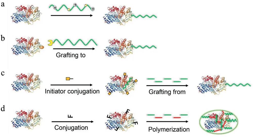(2)作者在文中綜述了利用保護性聚合物殼對酶進行包裹的方法,介紹了制備聚合物酶的方法,包括物理吸附和化學(xué)偶聯(lián)等;并結(jié)合應(yīng)用實例,對聚合物酶的合理設(shè)計進行了總結(jié);隨后,作者也對該領(lǐng)域研究的重點和發(fā)展進行了討論和展望。