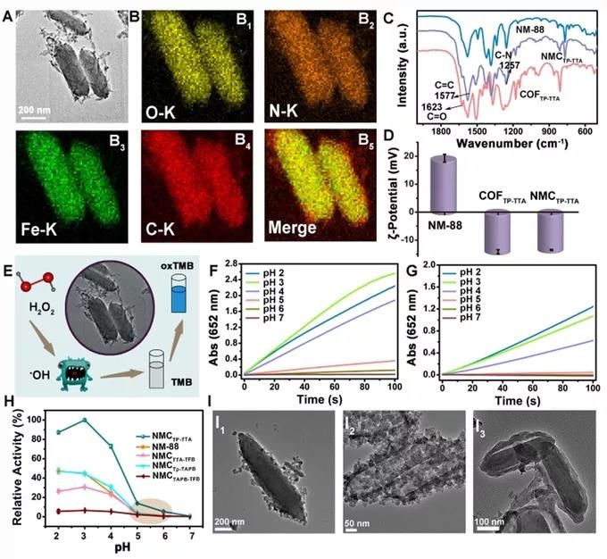 圖1,A)NMCTp-TTA的TEM圖像;B)EDS圖像;C,D)COFTp-TTA,NM-88和NMCTp-TTA的FT-IR和ζ電位;E)NMCTp-TTA的過氧化物酶樣活性示意圖;F,G)通過監(jiān)測(cè)pH 2–7在652 nm處TMB的吸收,NMCTp-TTA和NM-88的過氧化物酶樣活性。H)對(duì)它們的過氧化物酶樣活性的定性分析;I)NMCTTA-TFB,NMCTp-TAPB,NMCTAPB-TFB的TEM圖像。