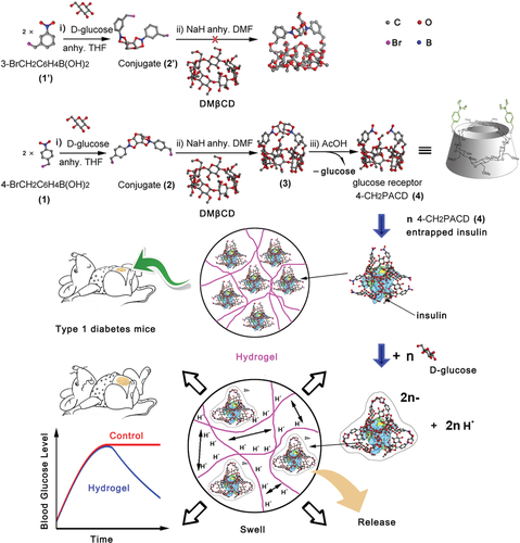 雙齒 β-CD 通過三個簡單的反應(yīng)很容易合成,從 DMβCD 和對(溴甲基)苯基硼酸開始。雙齒β-CD的形成過程被發(fā)現(xiàn)是尺寸選擇性的,因為從間(溴甲基)苯基硼酸試劑中,不能提供雙齒β-CD衍生物。雙齒 β-CD(即 4-CH2PACD)包含葡萄糖狹縫,并顯示出與 D-葡萄糖的高效特異性結(jié)合。合成的 4-CH2PACD 被摻雜到 PAAm 水凝膠中,賦予水凝膠對 D-葡萄糖的特異性反應(yīng)。具體而言,當凝膠在 D-葡萄糖溶液中平衡時,水凝膠的膨脹是可見的,而在 D-葡萄糖異構(gòu)體(如 D-果糖和 D-半乳糖)溶液中則收縮。發(fā)現(xiàn)這種特征有利于自我調(diào)節(jié)的特定葡萄糖響應(yīng)性胰島素釋放,因為溶液中高濃度的 D-葡萄糖會導(dǎo)致凝膠膨脹并增加網(wǎng)格尺寸。體內(nèi)試驗表明,在 T1DM 中預(yù)加載雙齒 β-CD 和短活性胰島素的 PAAm 水凝膠能夠?qū)崿F(xiàn)長期持續(xù)的血糖控制。預(yù)計這種簡便的合成方法將為雙齒 β-CD 作為各種重要生物化合物或代謝物的受體的合成打開一扇新的大門?紤]到 β-CD 與許多生物或藥物活性化合物之間的多功能主客體內(nèi)含物,以及雙齒 β-CD 與靶向生物分子之間的特定相互作用,為 DSGTIR 開發(fā)了一種新機制。