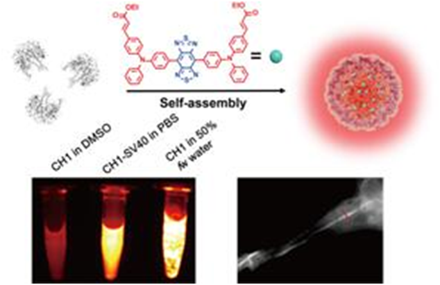 具有分子內扭轉電荷轉移(twisted intramolecular charge-transfer,TICT)和聚集誘導發光(aggregation-induced emission,AIE)性質的近紅外Ⅱ區有機熒光納米顆粒,作為新型活體熒光成像探針,具有高信噪比、高時空分辨等優點,但現有技術制備的有機納米顆粒存在粒徑難以精確控制、穩定性和生物相容性差等問題。針對該問題,李峰課題組與合作者利用雜合組裝策略,將TICT-AIE分子(CH1)包裝在SV40 VLP內腔,構建了粒徑均一(約21 nm)、高生物相容性和光穩定性的雜合有機納米顆粒CH1-SV40,熒光量子產率高達13.03%;利用CH1-SV40成功實現了血管成像和影像引導的腫瘤切除手術。該工作為生物醫學近紅外II區成像提供了新型納米探針(圖2),也為可控構建有機納米顆粒提供了新思路。相關成果發表于ACS Appl. Mater. Interfaces(DOI:10.1021/acsami.1c02691)。中南民族大學閔雪紅博士、武漢病毒所博士生張娟和中南民族大學碩士生李潤豪為該論文的共同第一作者,武漢病毒所李峰研究員和中南民族大學孫躍教授為論文共同通訊作者。