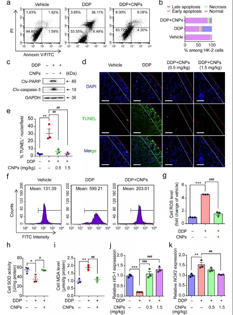 研究者們通過CNPs對于細胞凋亡信號的影響,來探索CNPs減輕AKI的機理。經DDP處理后,HK-2細胞凋亡率、PARP和caspase-3表達顯著增加,但再經CNPs處理后這些相關因素顯著下降。因而認為CNPs可顯著降低DDP引起的TUNEL凋亡水平。ROS是誘導凋亡的關鍵因素,CNPs可以清除DDP誘導的內源ROS,逆轉DDP對于SOD的抑制和MDA的升高。qRT-PCR分析表明CNPs可以降低DDP處理后的HO-1基因表達,提高NOX2基因表達,使它們的表達接近無DDP處理的原始水平。