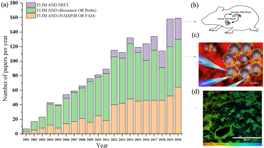 圖1. 從2001年1月至2020年12月,每年在FLIM領域結合NAD(P)H或FAD(橙色),探針,生物傳感器(綠色)和FRET(紫色)的出版物數量(數據來自Web of Science, 2021年1月)。(a) 2001年至2020年各領域論文數量的直方圖;(b) 使用RhoA-FRET生物傳感器小鼠來監測在發育和疾病進展期間哺乳動物組織中的RhoA活性。(c) 在激光激發下,應用 TCSPC-FLIM檢測乙酰轉移酶生物傳感器用于實時監測胞內乙酰轉移酶活性。(d) 膠質母細胞瘤干細胞(Glioblastoma stem cell,GSC)中NADH時間分辨熒光圖像。