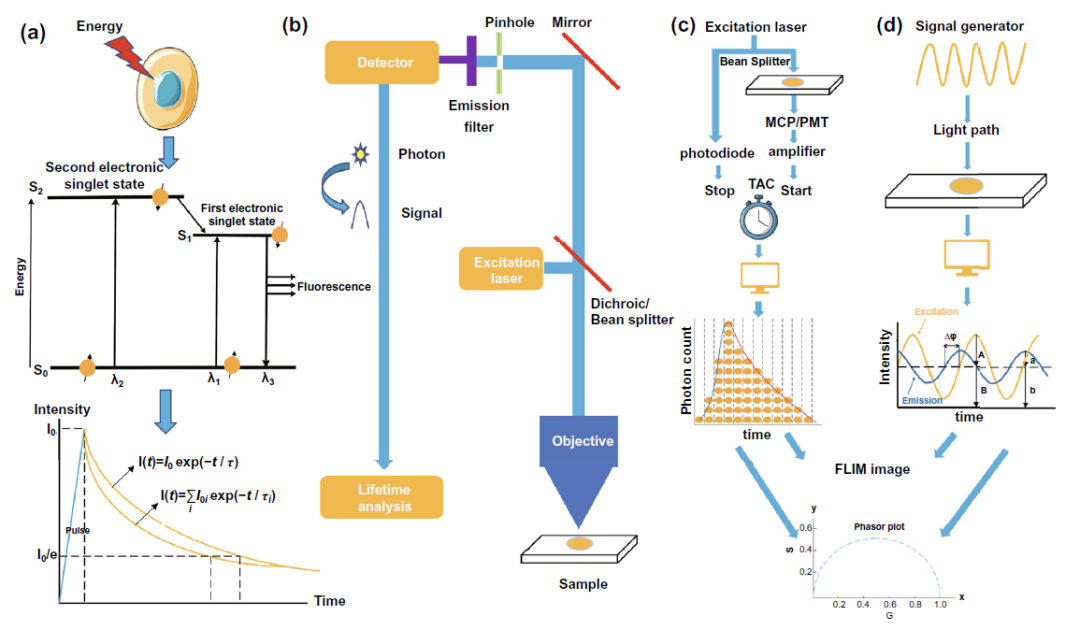 圖2. 熒光時間,熒光成像,TCSPC-FLIM和頻域FLIM的基本概念。(a) 熒光時間測量的基本原理。(b) 配備有熒光時間分析裝置的熒光成像儀的基本構造。(c) TCSPC-FLIM裝置示意圖。(d) 頻域FLIM裝置示意圖。