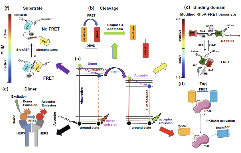 圖5. FLIM-FRET在癌癥診斷和療效提升領域內的應用。(a) FRET熒光分子對中熒光供體和受體分子間FRET現象的模式簡圖。(b) cleavage型:利用FRET-FLIM對caspase3的活性進行檢測指示細胞凋亡狀態。(c) Binding domain型:利用FRET-FLIM對RhoA蛋白的活性進行檢測,通過相連的RFP和GFP熒光蛋白分子間是否發生FRET現象評估RhoA蛋白活性。(d) Tag型:利用標記在PKB蛋白上相連的絲氨酸和蘇氨酸熒光分子標記的FRET效應變化評估胞內PKB/Akt信號通路活性。(e) Dimer型:利用在HER3和HER2上標記的Alexa546和Cy5熒光分子對的FRET現象對細胞膜上HER3-HER2二聚體水平進行檢測。(f) Substrate型:利用Src與底物反應后導致底物相連的CFP和YPet熒光蛋白分子間FRET效應消失的現象對細胞內Src蛋白的活性進行檢測。