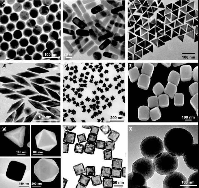 圖1. 采用自下而上的方法合成具有不同形狀的AuNP。(a) 球,(b) 棒,(c) 棱鏡,(d) 雙錐,(e) 星,(f) 立方體,(g) 多邊形納米晶體, (h) 籠,(i) 金@二氧化硅雜化納米顆粒。