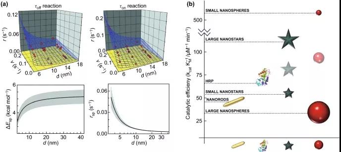 圖2. 不同粒徑和形狀AuNPs催化效率的比較。(a) 不同粒徑AuNPs催化resazurin還原為resorufin的動力學研究。它顯示了NP大小如何影響表面重構率與催化產物形成(左上)和產物離解(右上)的轉化率的關系,以及NP大小與活化能(左下)和自發動態表面重構率(右下)的關系,(b) 比較不同形狀和大小的AuNP對類過氧化物酶活性的催化效率。HRP,它們的生物學對應物,也包括在圖表中。