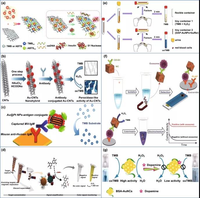 圖5. 用作臨床診斷工具的AuNPs的過氧化物酶樣活性。(a) 生長在石墨烯片上的AuNP用于開發“開-關”色度傳感器。(b) 納米金/碳納米管雜化技術用于流感病毒的比色檢測。(c) 用于麻疹病毒檢測的棒狀金鉑核/殼納米粒子。(d) 納米磁性微球與金納米粒子聯用分離檢測流感病毒。(e) 方便用戶的尿樣血紅蛋白和紅細胞檢測設備。(f) 載金納米多孔氧化鐵納米粒用于直接外體檢測。
