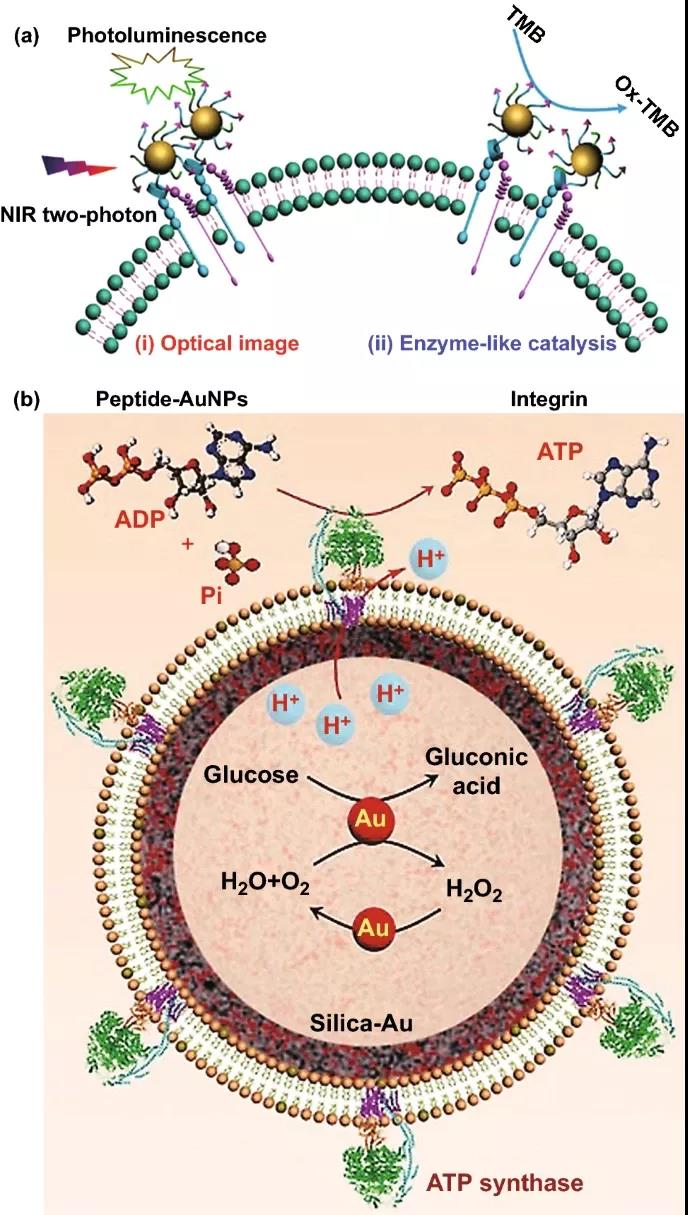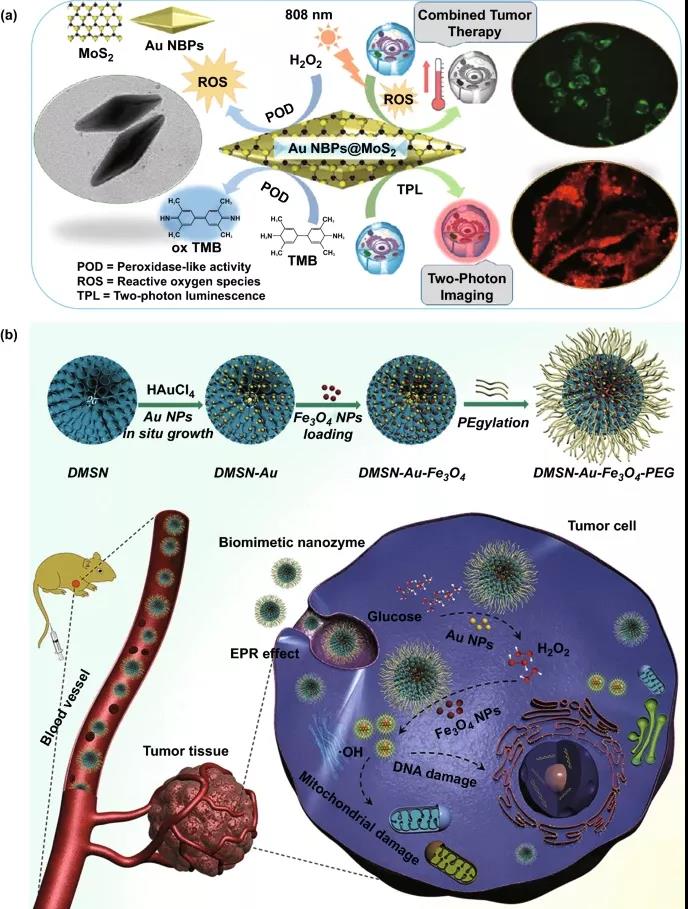 圖6. 應用于腫瘤治療的金納米酶。(a) 過氧化物酶樣活性與光動力和光熱療法相結合,用于腫瘤成像和局部治療。(b) 在將NPs引導至相應的組織后,各種酶活性結合在一起在細胞內產生ROS。