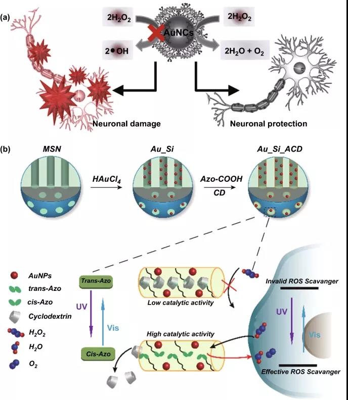 圖8. 金納米酶用作細胞保護的活性氧清除劑。(a) 胺封端樹狀大分子包埋的AUNC的過氧化氫酶樣活性,用于保護神經元免受氧化損傷。(b) 光介導的載AuNPs介孔NP對ROS水平的可逆調節。