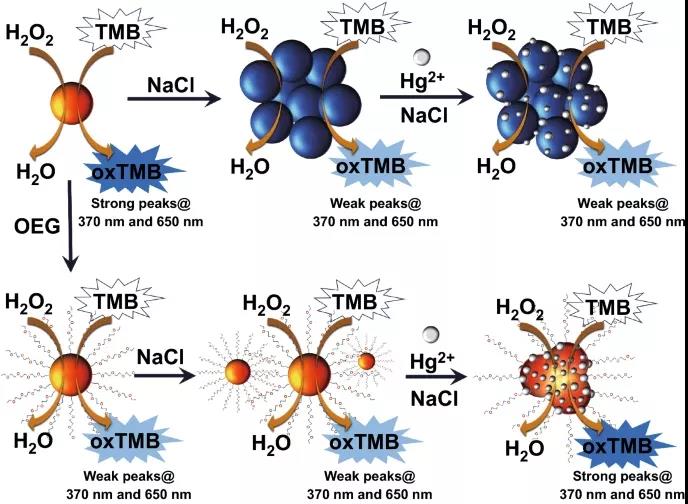 AuNPs具有的過氧化物酶模擬活性使其被用作能夠產生色度信號的信號傳感器。目前,金納米材料主要用于氧化3,3′,5,5′-四甲基聯苯胺(TMB,一種由辣根過氧化物酶HRP催化的底物,廣泛用于免疫分析)。由于易于用特定配體進行表面修飾,金納米材料可用于開發針對不同靶點的診斷工具,如病毒、外顯子體、紅細胞、氨基酸甚至離子。除有色產物外,金納米酶還可以催化不同底物轉化為熒光、發光或拉曼活性產物;一些系統利用反應中產生的電子來開發電化學傳感器。