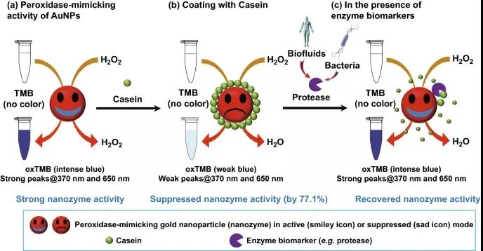圖10. 利用金納米酶的比色傳感器檢測食品腐敗或人類疾病的蛋白水解生物標志物。