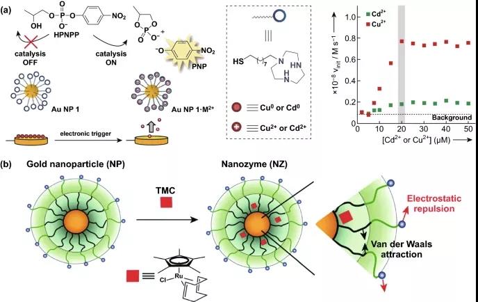 圖12. 傳統的納米酶定義結合了金納米粒子和金屬離子作為催化劑。(a) AuNP結合單分子膜絡合Cd2⁺和Cu2⁺離子對HPNP的催化裂解。(b) Ru催化劑嵌入AuNPs保護層。