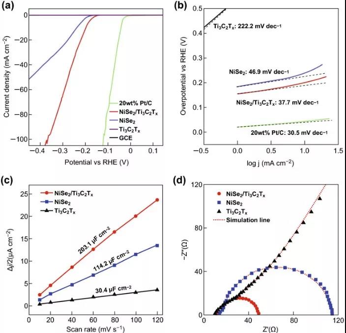 圖4 在0.5 M H2SO4溶液中的催化性能:(a)未改性的NiSe2、NiSe2/Ti3C2Tx復合物、純Ti3C2Tx、20 wt%Pt/C在掃描速率為5 mV/s的玻碳電極的LSV曲線。(b)未改性的NiSe2、NiSe2/Ti3C2Tx復合物、純Ti3C2Tx、20 wt%Pt/C的Tafel圖。(c)用循環伏安法提取不同電極的雙層電容。(d)不同電極材料阻抗圖。